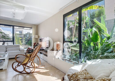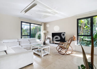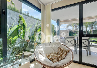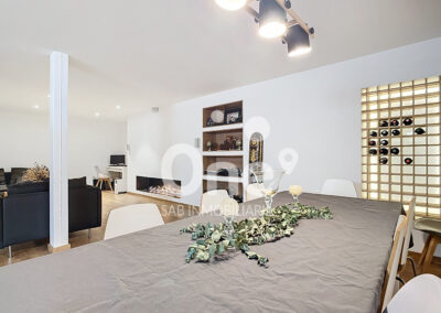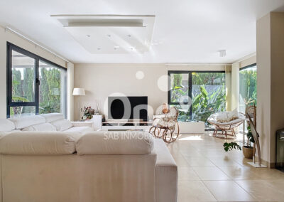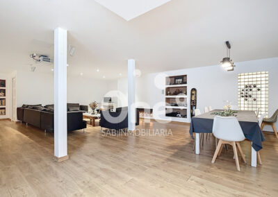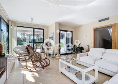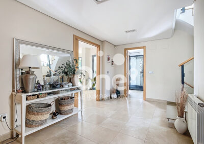 Desde el primer paso, el gran recibidor ya anticipa lo que está por venir. A la izquierda se abre un elegantísimo salón comedor, bañado por luz natural gracias a sus grandes ventanales, que conectan de forma perfecta el interior con el exterior. La sensación de continuidad entre la vivienda y las terrazas, tanto en fachada principal como posterior, aporta una experiencia residencial abierta, luminosa y sofisticada.