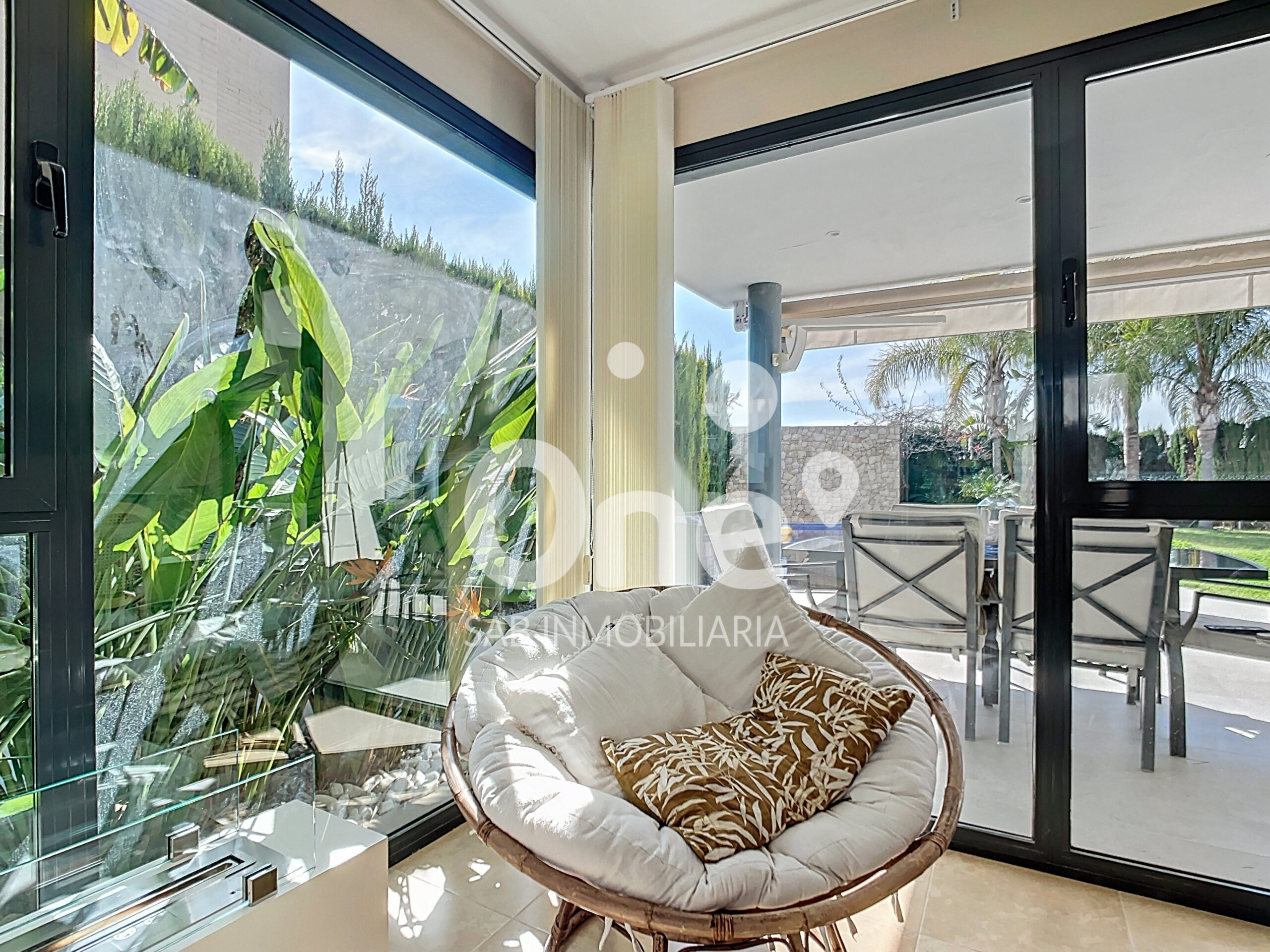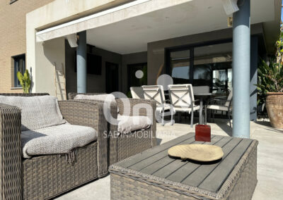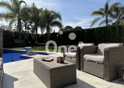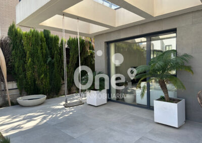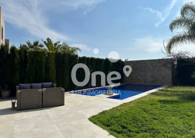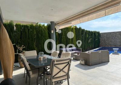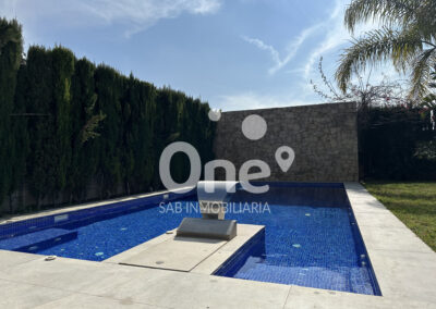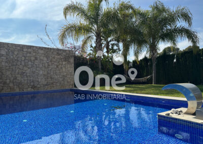 El exterior está diseñado para disfrutar todo el año. La piscina de cloración salina con jacuzzi integrado se convierte en la gran protagonista de la zona posterior orientada al suroeste, acompañada de un baño completo exterior con ducha, aportando comodidad y funcionalidad sin renunciar a la estética. Completan el exterior dos amplias terrazas, la posterior con altavoces Bose, jardín consolidado con paisajismo cuidado al detalle, césped natural, riego por aspersión y un paellero ideal para celebraciones.
